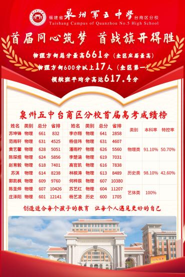 【喜报】巧思驭机,智创未来——泉州五中台商区分校学子在第八届泉州市青少年机器人竞赛中喜获佳绩! 11-24 【喜报】探求科学世界,感受光影魅力——泉州五中台商区分校学子荣获2025年福建省青少年科学影像节二等奖 11-24 【喜报】深耕沃土 芬芳自来——我校洪玲凤老师入选“福建省2025年乡村优秀青年教师培养支持计划” 11-23 【喜报】国赛争光!泉州五中台商区分校初中学子勇夺世界机器人大会青少年设计大赛国家级奖项! 11-22 【喜报】活力绽放,荣光闪耀!泉州五中台商区分校啦啦操队在市赛中斩获佳绩! 11-11 【喜报】泉州五中台商区分校在2024-2025年区中小学生运动会勇夺初中组团体总分冠军!高中组团体总分殿军! 11-11 【喜报】载誉归来!泉州五中台商区分校五祖拳队伍市赛“打”出佳绩,一举冲进全市前三! 11-03